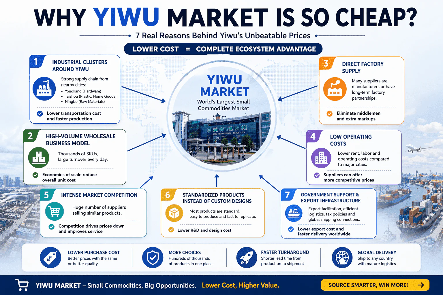 The low pricing in Yiwu Market is not a coincidence. It comes from a complete sourcing ecosystem built on industrial clusters, high-volume wholesale models, strong competition, direct factory connections, low operating costs, standardized products, and mature export infrastructure.